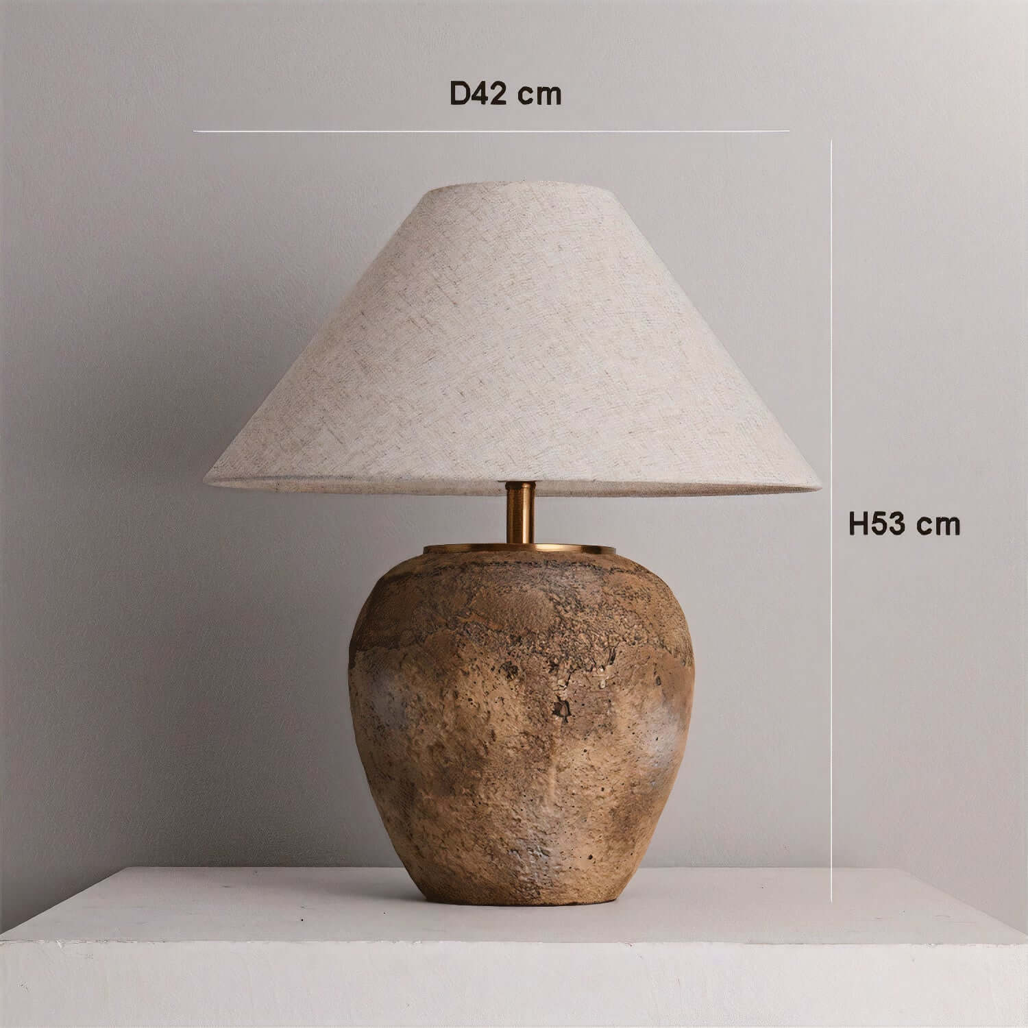 This artisan style table lamp offers a circular base, designed with a pottery like ceramic design. You will adore the earthy tones and enjoy the classic lamp shade that creates a timeless approach to tabletop lighting. The versatility of this piece is undeniable and you will love adding a lovely piece of art to your surface.