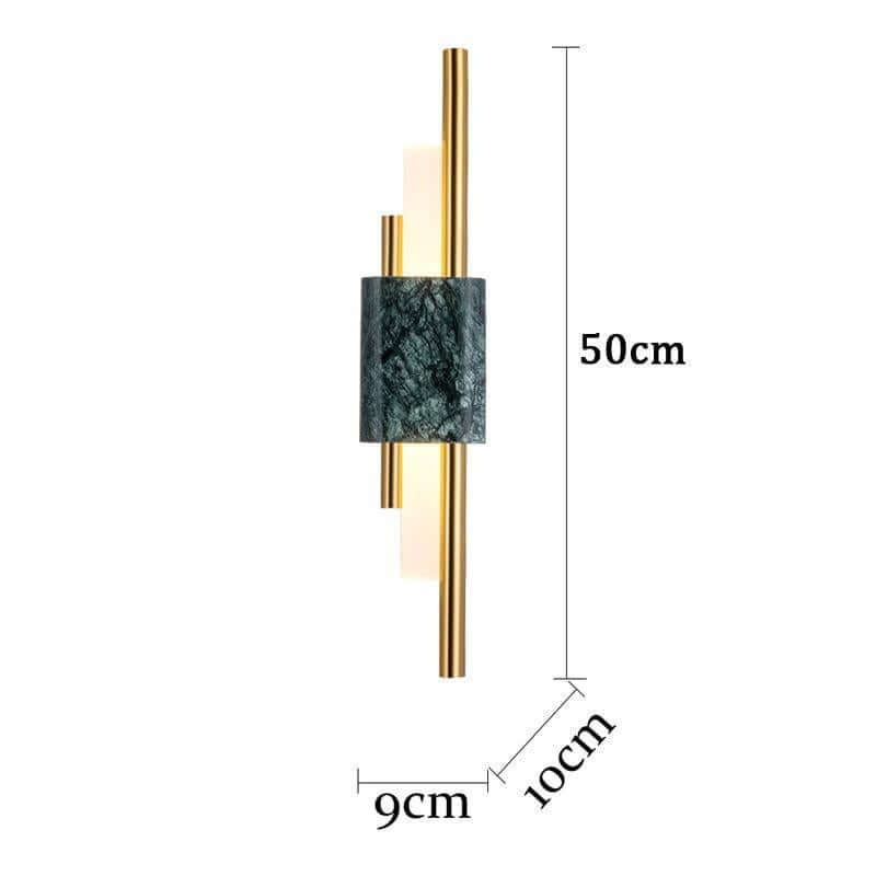 The Soren Wall Lamp is an exquisite addition to any home. Artfully crafted from green and white marble with two gold pipes suspended elegantly from the top and bottom, this simplistic yet stately lamp will bring a touch of sophistication and contemporary flair to your living space. This exquisite piece of luxury fits harmoniously with interiors of varied tastes.
